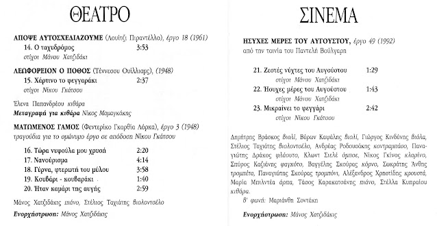 Στη δεύτερη κατηγορία έχουμε πέντε τραγούδια από την "Οδό Ονείρων" (1962) για πιάνο, κοντραμπάσο και φυσαρμόνικα που ενορχήστρωσε ο Θόδωρος Κοτεπάνος, δυο τραγούδια για κλασική κιθάρα που εναρμόνισε ο Νίκος Μαμαγκάκης με την Έλενα Παπανδρέου στην κιθάρα παρμένα από τα θεατρικά έργα "Λεωφορείον ο Πόθος" (1948) και "Απόψε αυτοσχεδιάζουμε" (1961) και πέντε τραγούδια από τον "Ματωμένο Γάμο" (1948) του Lorca σε ελληνική απόδοση Νίκου Γκάτσου που ενορχήστρωσε ο συνθέτης για πιάνο και βιολοντσέλο.